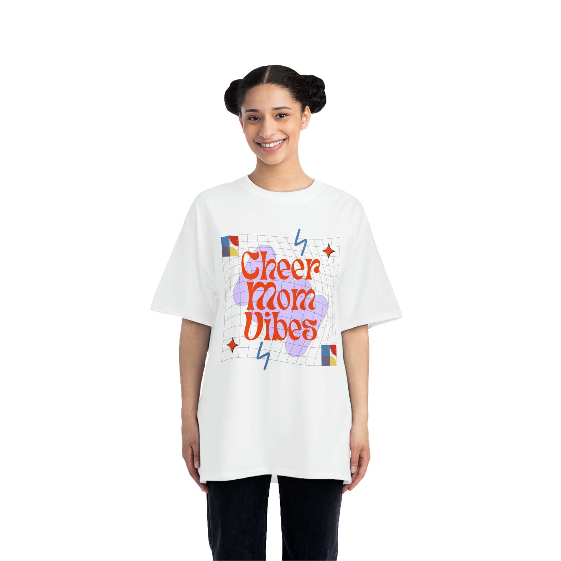 "Cheer Mom Vibes" 90's Inspired Oversized White T-Shirt - Embrace the Retro Cheer Spirit! Key Features: Nostalgic 90's Inspired Graphic Design Oversized Fit for Comfort and Style Soft and Breathable White T-Shirt Fabric Available in Sizes S to 3XL for Every Cheer Mom