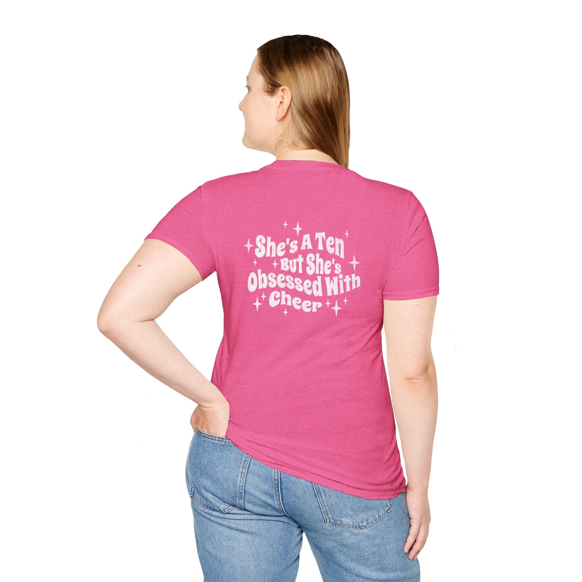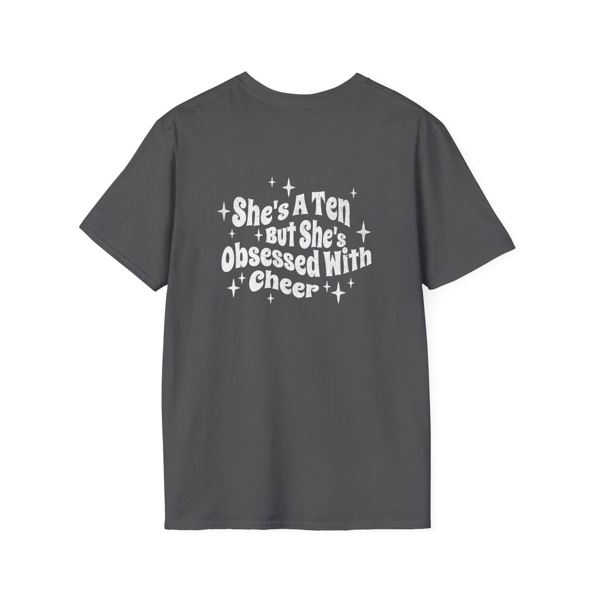 - "She's A Ten But Obsessed With Cheerleading" on the back