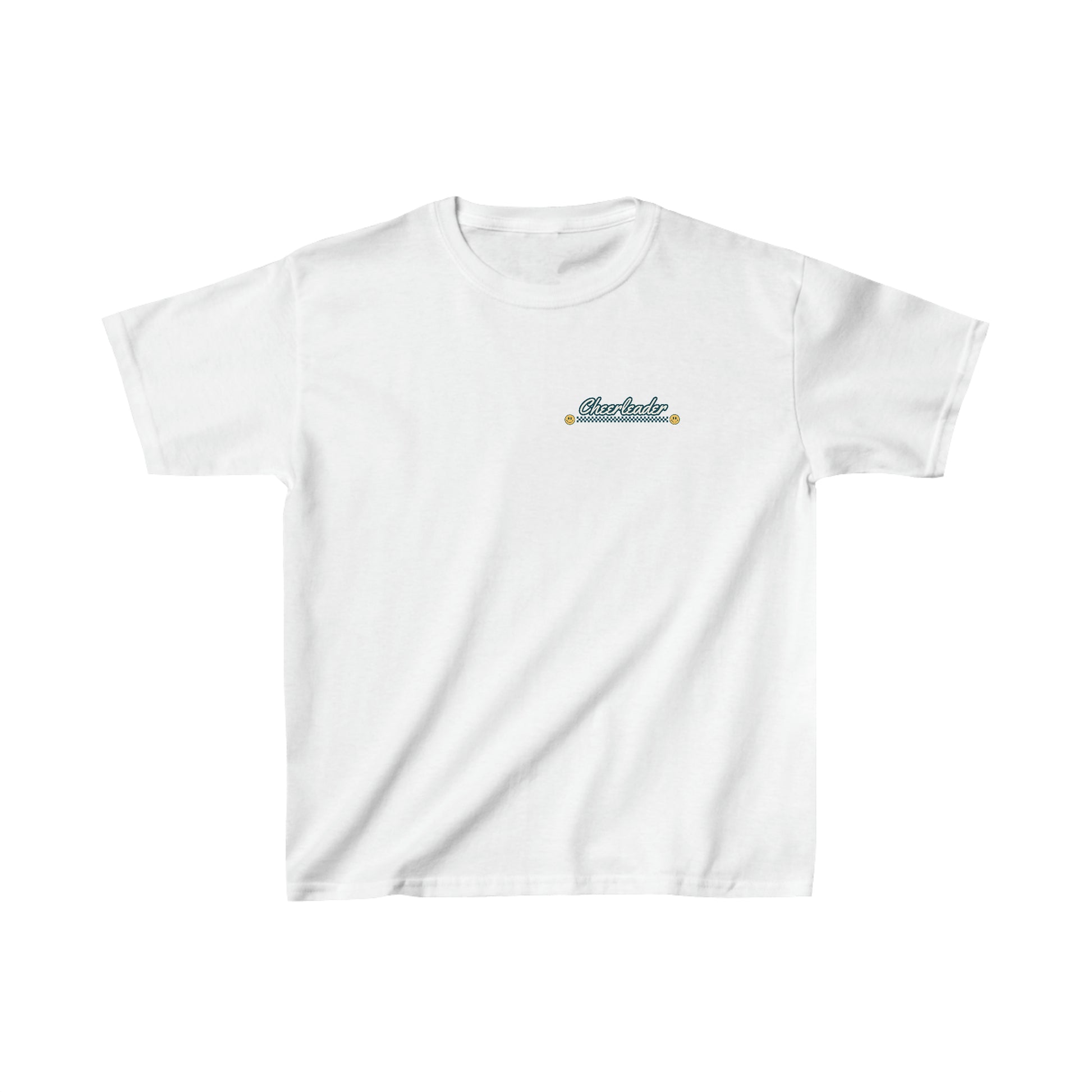 On the front of the shirt, you'll find the word "Cheerleader" boldly printed in funky 70's style lettering, instantly showcasing your passion for cheerleading. Turn to the back, and you'll discover the empowering message "Positive Mat Talk Only" in eye-catching font, reminding everyone to spread positivity and encouragement on the mat.